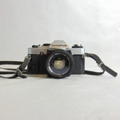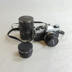 Set per macchina fotografica analogica Olympus che comprende: macchina fotografica a pellicola Olympus OM 20 funzionante con obiettivo Olympus 50mm, F1.8 e filtro polarizzatore; teleconverter Olympus 1.5x con anello adattatore 49-52 mm; teleobiettivo Olympus 135mm F3.5. Tutto in buone condizioni, solo da ripulire, con lenti intatte e diaframmi funzionanti.