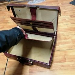 Valigia rigida in pelle vintage, vari scomparti interni, dettagli e piedini metallici, chiave assente.