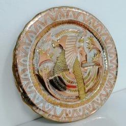 Piatto decorativo in metallo realizzato con la tecnica a sbalzo, con rappresentazione di un faraone Egiziano e motivi ai bordi. Completo di gancio per essere appeso, grandi dimensioni, molto bella l’armonia tra i tre colori oro, argento e rame.