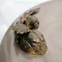 Bel piatto centrotavola / portafrutta vintage versatile e decorativo, in acciaio inox A1000, con decorazione di verdura (carciofo, baccello, aglio). Ha piedini sul fondo.