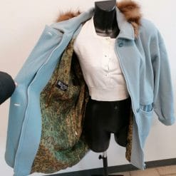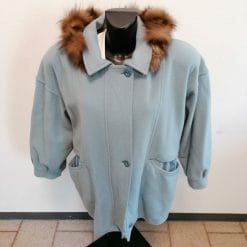 Cachemire e lana, morbidissimo giaccone parka azzurro con taglio anni 90. Cappuccio removibile con bordo in eco pelliccia. Regolabile con coulisse, foderato, due ampi tasconi.