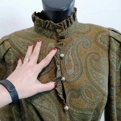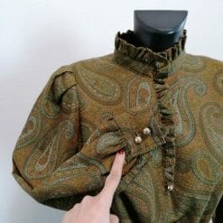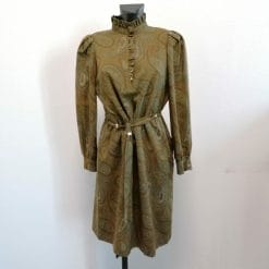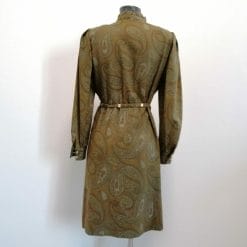 Vestito anni 70 con disegno paisley sui toni del verde e del marrone. Collo austero con piccole rouches a nascondere i bottoni, cintura in pendant con piccoli accenti metallici, polsini e spalle con leggero sbuffo. Zip sul lato. Parte inferiore foderata, tessuto probabilmente lana leggera.