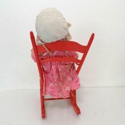 Un bambolotto vestito di rosa seduto sul dondolo, e un secondo con corpo morbido e arti di gomma. Buona condizioni generali ma da pulire, soprattutto gli abiti.