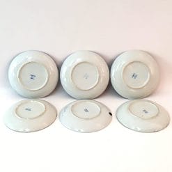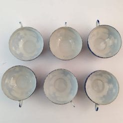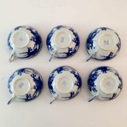 Elegante servizio da te in finissima porcellana giapponese decorato nel classico blu con motivo tradizionale del drago. Il servizio è composto da sei tazze con il rispettivo piattino, il tutto in pregiata porcellana. Le tazzine in particolare si notano per la loro leggerezza in quanto lavorate molto finemente, fin da rendere la porcellana traslucida; tanto da indovinare i decori sulla parte esterna. L’oggetto è in buone condizioni generali, la lavorazione a mano comporta la non uniformità del singolo pezzo e la non standardizzazione tra loro. Un piattino presenta una vistosa macchia (sembra una bruciatura) fortunatamente sulla parte sottostante, invisibile una volta servito.