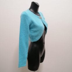 La chiusura con una clip metallica argentata, adornata con brillantini scintillanti tipo strass, aggiunge un tocco di glamour e raffinatezza al capo. Questo bolero angora retro azzurro è morbido al tatto e mantiene il corpo al caldo in modo avvolgente, rendendo ogni indossatrice o indossatore irresistibilmente trendy e alla moda durante la stagione invernale. È un capo ideale per un tocco di lusso nei giorni più freddi, offrendo comfort e stile in un unico pacchetto.