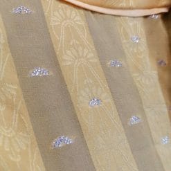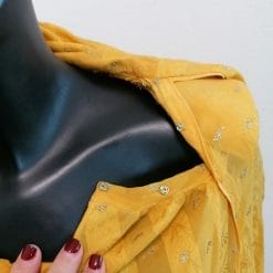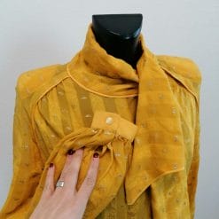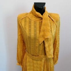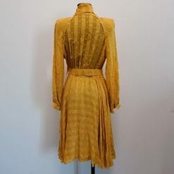 Abito handmade sartoriale anni 70 con fiocco, piccola allacciatura obliqua sulla spalla e lunga zip sul fianco. La parte superiore è semi-trasparente mentre la gonna è foderata. Cintura coordinata. Colore giallo a righe con pattern di fili brillanti.