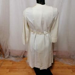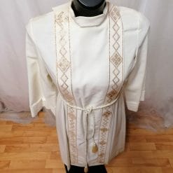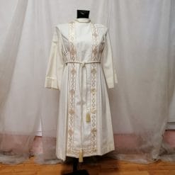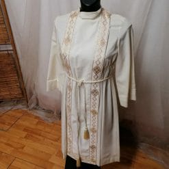 Abito da comunione in cotone, composto da veste bianca semplice taglio impero con elastico sotto il seno e zip sulla schiena + grembiale decorato in filo oro da sovrapporre, con bottoni automatici + cintura in corda.