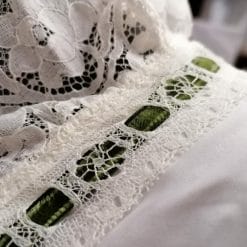 Abito da sposa sartoriale bianco con profili in velluto verde, finiture in pizzo, realizzato in poliestere.