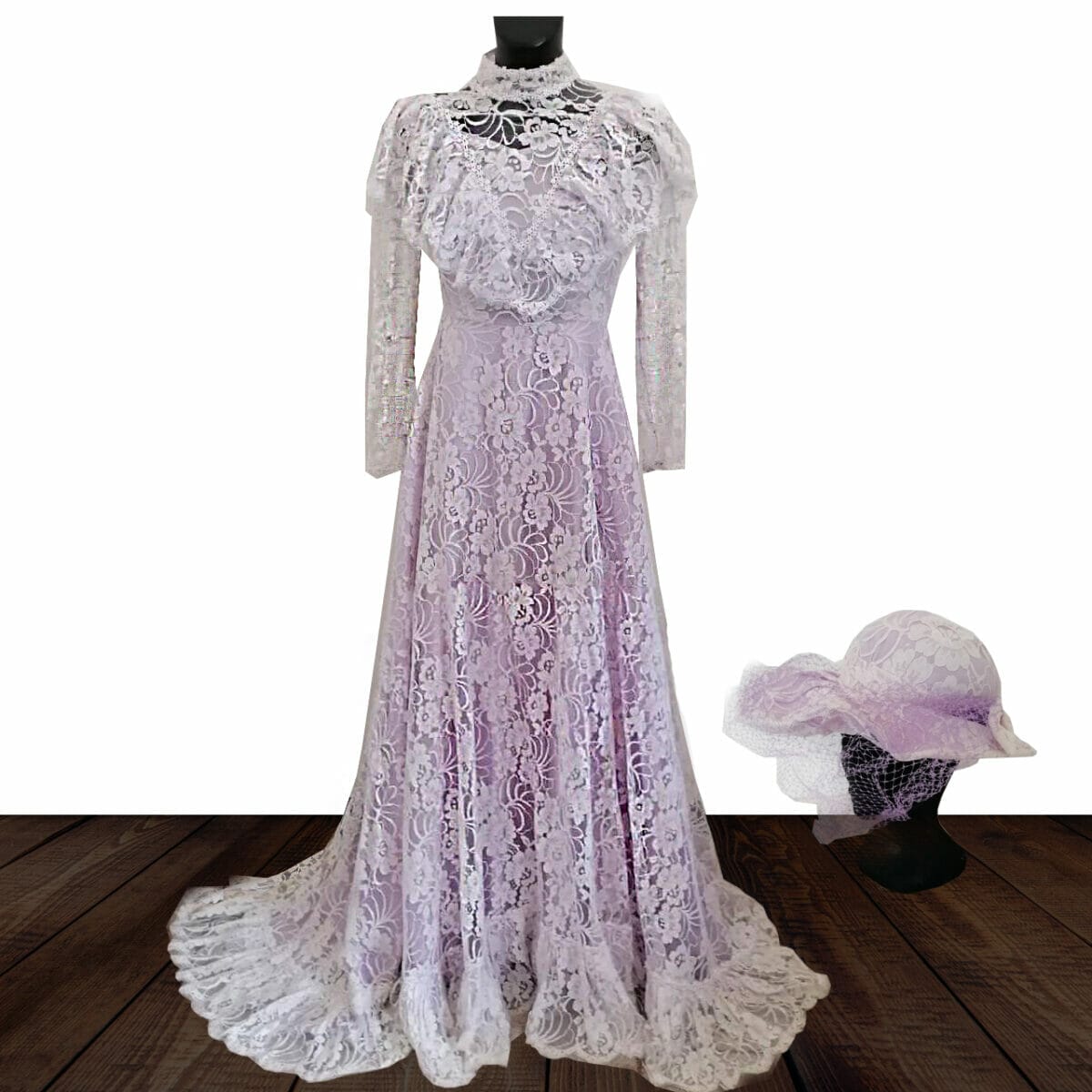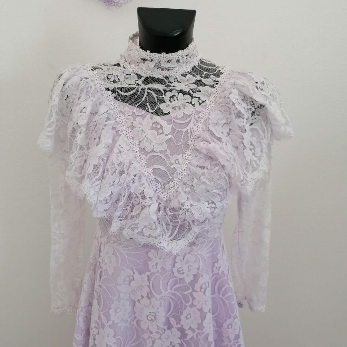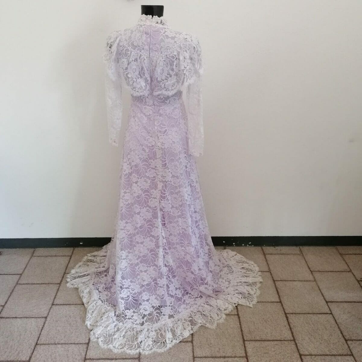 Questo abito da sposa dei primi anni ’00 è un capolavoro di eleganza e originalità. La combinazione di pizzo bianco sovrapposto a un abito lilla crea un contrasto sorprendente e unico, conferendo un tocco di modernità a uno stile tradizionale. La linea vittoriana dell’abito, con il suo colletto alto e le maniche lunghe sempre in pizzo, richiamano l’eleganza e la grazia delle epoche passate.