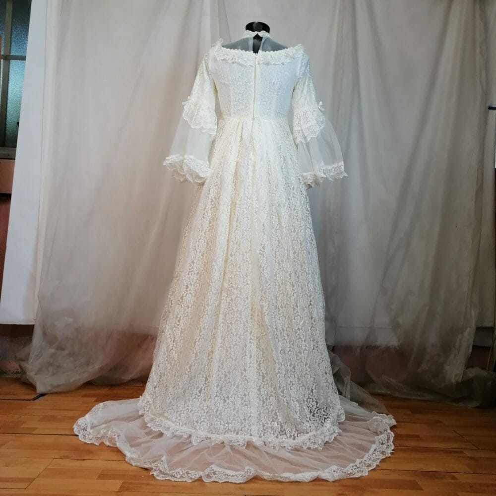 Un abito da principessa delle favole questo in pizzo e tulle. Un vestito da sposa vintage degli anni 90, che ricorda ancora un po’ i volumi e certi eccessi del decennio precedente ma già in una versione più sobria. Ovviamente preloved, perchè qualcuno senz’altro lo ha amato molto, colpisce per le trasparenze e l’uso generoso del pizzo. Completa questo abito da cerimonia di riuso un pettinino con fiori applicati a cui è attaccato il velo.