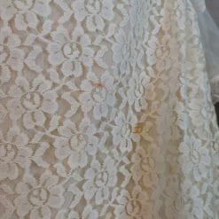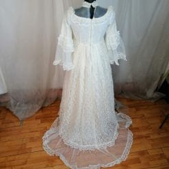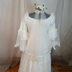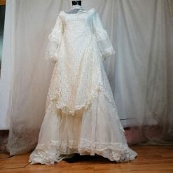 Un abito da principessa delle favole questo in pizzo e tulle. Un vestito da sposa vintage degli anni 90, che ricorda ancora un po’ i volumi e certi eccessi del decennio precedente ma già in una versione più sobria. Ovviamente preloved, perchè qualcuno senz’altro lo ha amato molto, colpisce per le trasparenze e l’uso generoso del pizzo. Completa questo abito da cerimonia di riuso un pettinino con fiori applicati a cui è attaccato il velo.