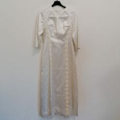 Le margherite bianche, delicate e romantiche, sono distribuite con grazia su un tessuto lucido e pesante dello stesso colore, creando un contrasto di texture che cattura l’attenzione. L’abito evoca un fascino rétro intramontabile, richiamando l’eleganza sofisticata di un’era passata.