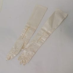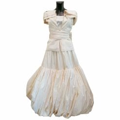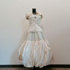 Abito da sposa anni 80 in seta, modello a meringa, composto da semplice abito dritto a sottoveste in poliestere, ampia gonna, corpetto con fila di bottoncini e spalle scoperte (non si chiude sul manichino), fascia con fiocco e lunghi guanti.