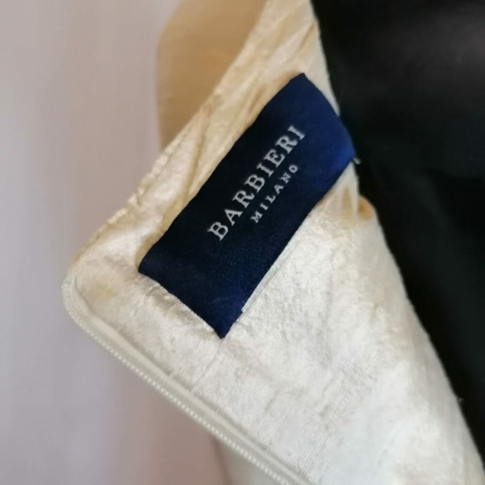 Bellissimo ed elegante questo abito della sartoria Barbieri Milano. Realizzato in seta, è un modello semplice e di grande impatto. Coniuga una certa austerità delle linea ad un tono champagne che grazie alla texture del tessuto assume una parvenza dorata