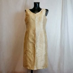 Pregiato abito in seta sartoriale di Barbieri Milano. Smanicato con zip posteriore e spacchetto in un’elegante tonalità di champagne dorato.