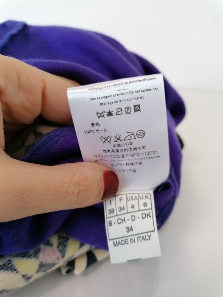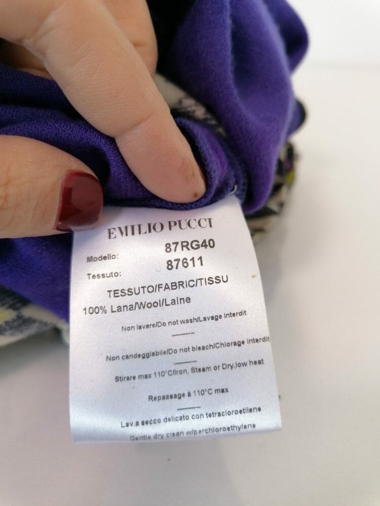 Vestito anni ’90 firmato Emilio Pucci, il Marchese di Barsento, fenomeno della moda dagli anni ’50 in poi. Il capo è decorato con fantasie geometriche su sfondo viola. L’abito taglio impero è caratterizzato dalla manica leggermente svasata. Un capo prezioso e in ottime condizioni.