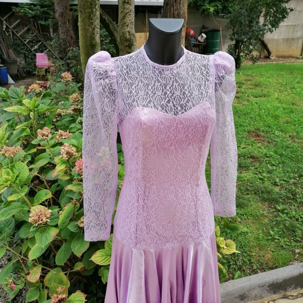 Particolare abito asimmetrico in raso lilla, molto ben caratterizzato dalla gonna lunga solo posteriormente e il corpetto in pizzo con maniche a palloncino