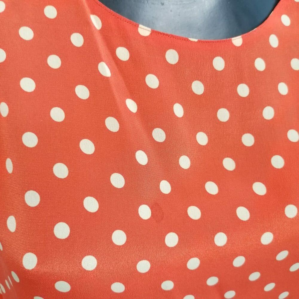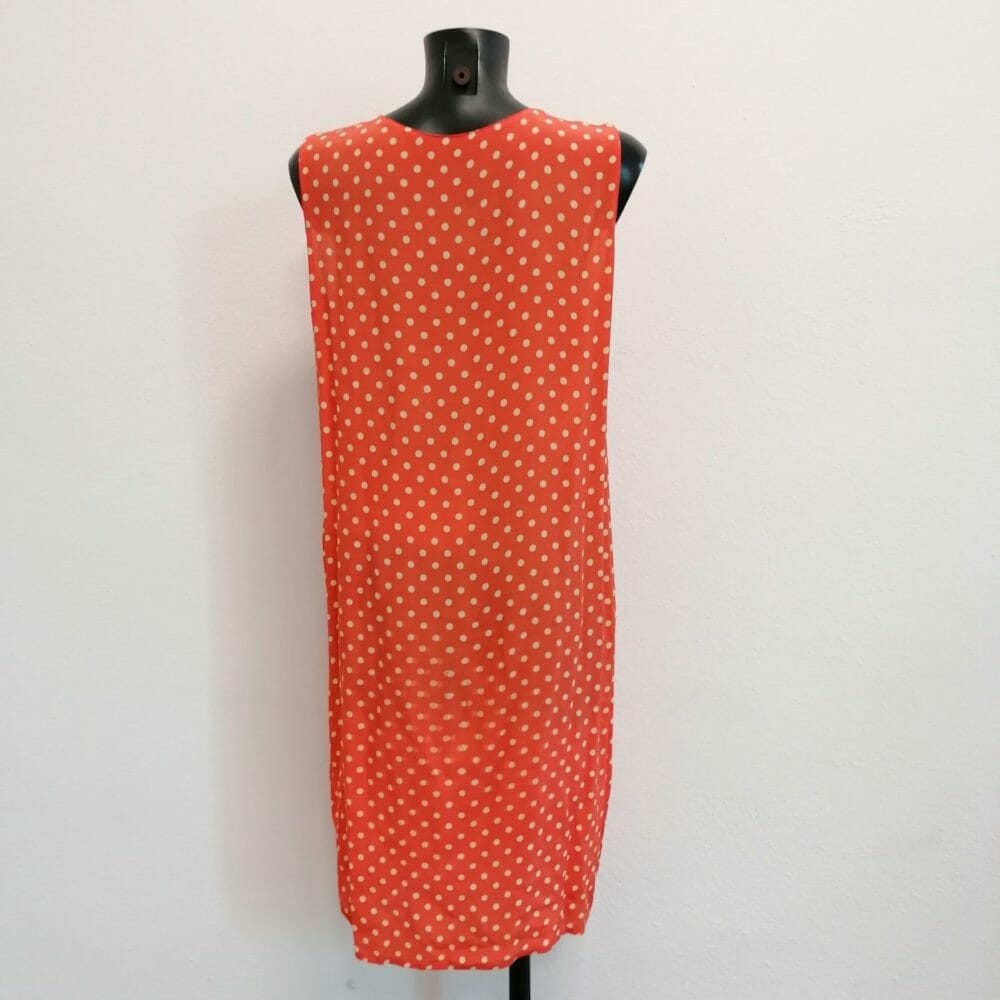 Abito di seta vintage a pois bianchi su fondo rosso corallo. Dritto smanicato, sfoderato, con spacchetti sui lati. Taschino sul petto.