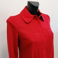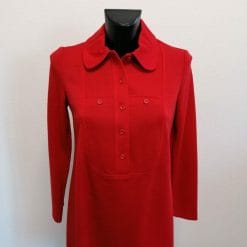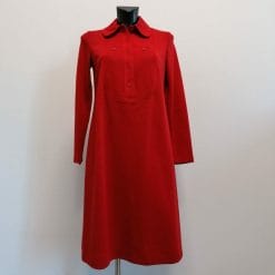 Vintage, abito dritto rosso, tessuto pesante acrilico misto lana. Motivo con bottoni sul petto e colletto stondato, maniche lunghe.