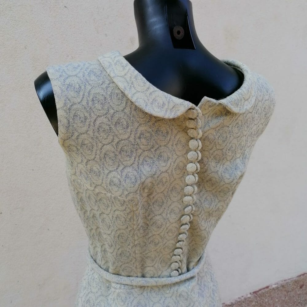 Abito sartoriale con giacchetto. Tessuto elasticizzato decorato con lurex, cintura in vita, finti bottoni dietro che nascondono comodi automatici. Smanicato, foderato nella parte della gonna, ha una zip sul fianco.