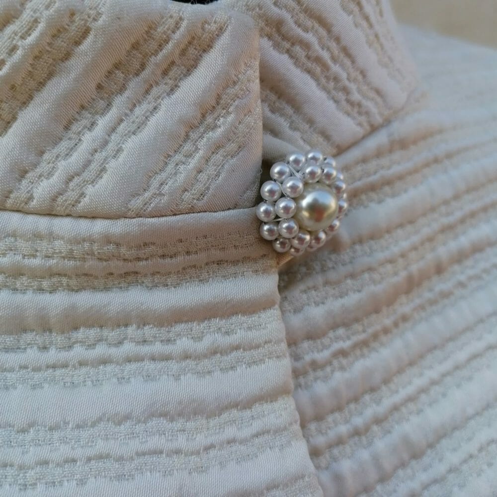 Proposto con un giacchetto corto, maniche tre quarti e bottoni di perline, foderato fatto a mano.