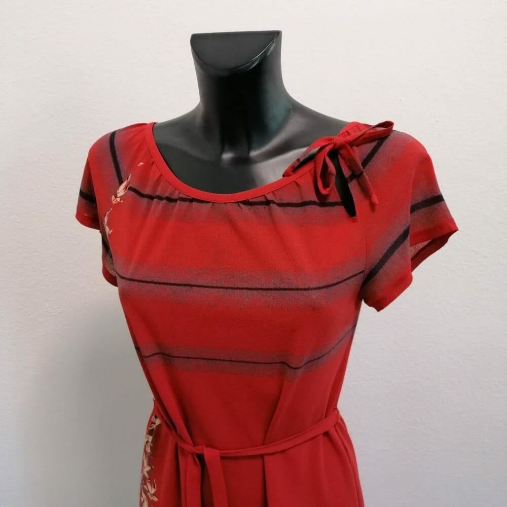 Abito svasato in crêpe semi trasparente rosso con motivo di fiori e righe, cintura inclusa. Mezze maniche ad aletta, scollo a barca.