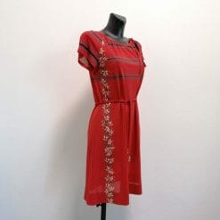 Abito svasato in crêpe semi trasparente rosso con motivo di fiori e righe, cintura inclusa. Mezze maniche ad aletta, scollo a barca.