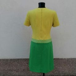 Questo delizioso abito anni 60 verde e giallo è decorato da piccoli bottoncini madreperlati. Il vestito è doppiato con una sottoveste per cadere meglio sulla persona, grazie anche alle pence del corpetto. L’indumento è in jersey (70% dacron e 30% schurw/lana). Condizioni perfette tranne qualche macchia.