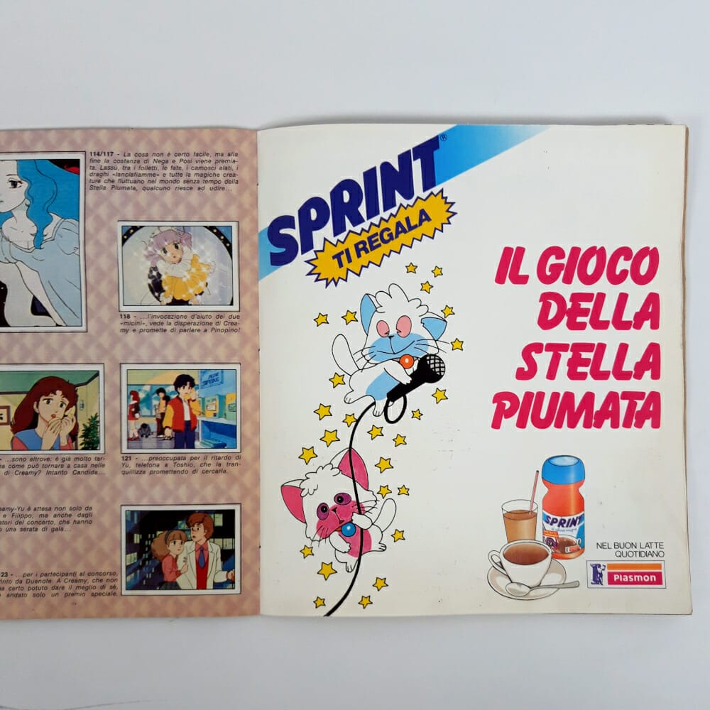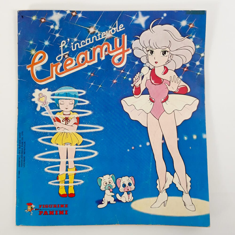 Raro album figurine Panini (1985) dedicato al famoso cartone animato L’incantevole Creamy. L’album non è completo, mancano circa 8 figurine. Non compilato, esente da scritte. L’oggetto è in discrete condizioni generali, lieve ingiallimento delle pagine lungo i bordi e un piccolissimo strappo (1cm circa) sulla prima di copertina.