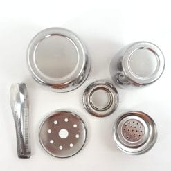 Iconici shaker e cestello per ghiaccio  con pinza originale della ALFRA Alessi dei primi anni ’50. Gli oggetti sono completi, puliti ed in ottime condizioni generali. Lo shaker presenta due minuscoli puntini  (uno a metà altezza e uno vicino al bordo) dove la cromatura è segnata; il cestello per ghiaccio ha dei leggerissimi sfrisi nella cromatura su un lato (visibili solo in controluce, effetto forse dello sfregamento con la pinza).