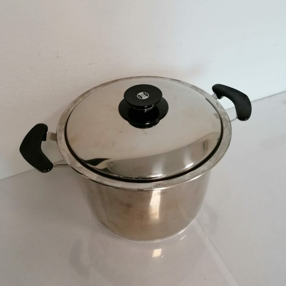Pentola AMC diametro 22,5 cm, altezza 18 cm, larghezza con manici inclusi 29 cm. Il pomello è rotto ma ancora perfettamente utilizzabile, si può sostituire.