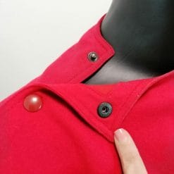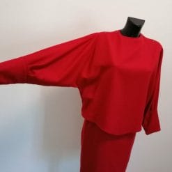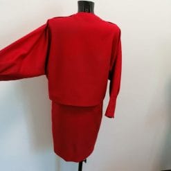 Abito vintage anni 80 rosso fuoco, cucito in maniera da sembrare un completo ma si tratta di un vestito. Foderato, in lana, ha maniche a pipistrello e bottoni a pressione alla scollatura.