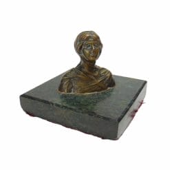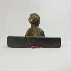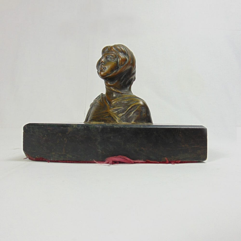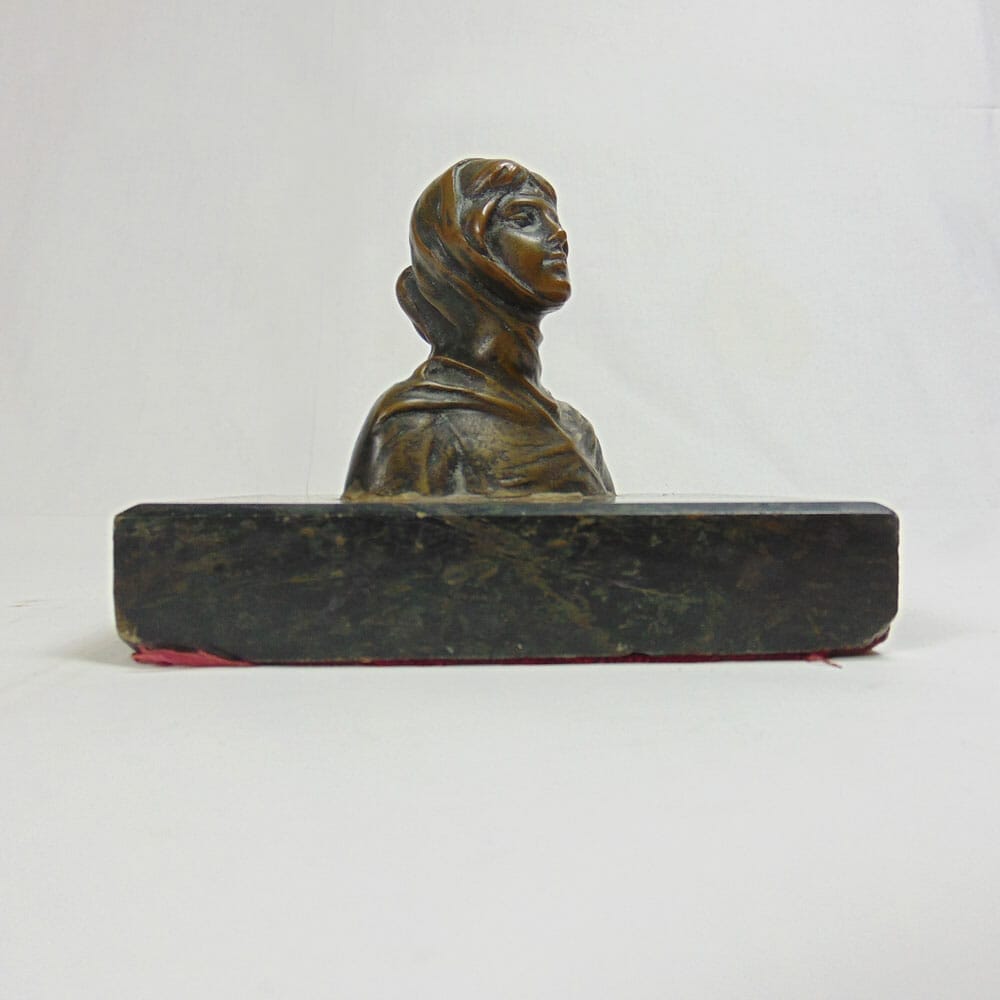 Antico bronzetto dell’800 raffigurante un busto di dama medioevale, con basamento quadrato in marmo nero e verde scuro. In ottime condizioni, presenta una fodera rossa sul fondo per non rovinare i mobili.