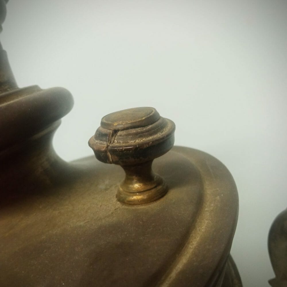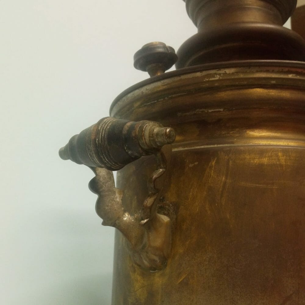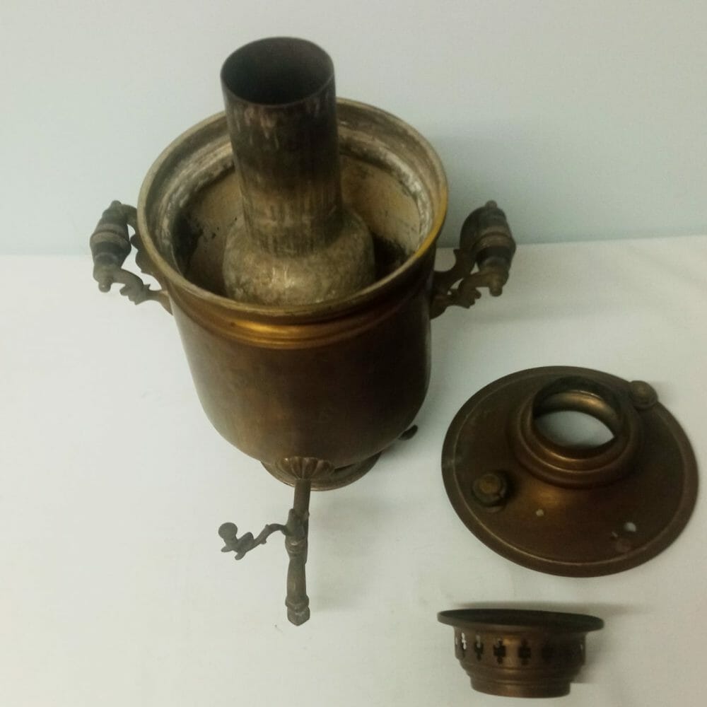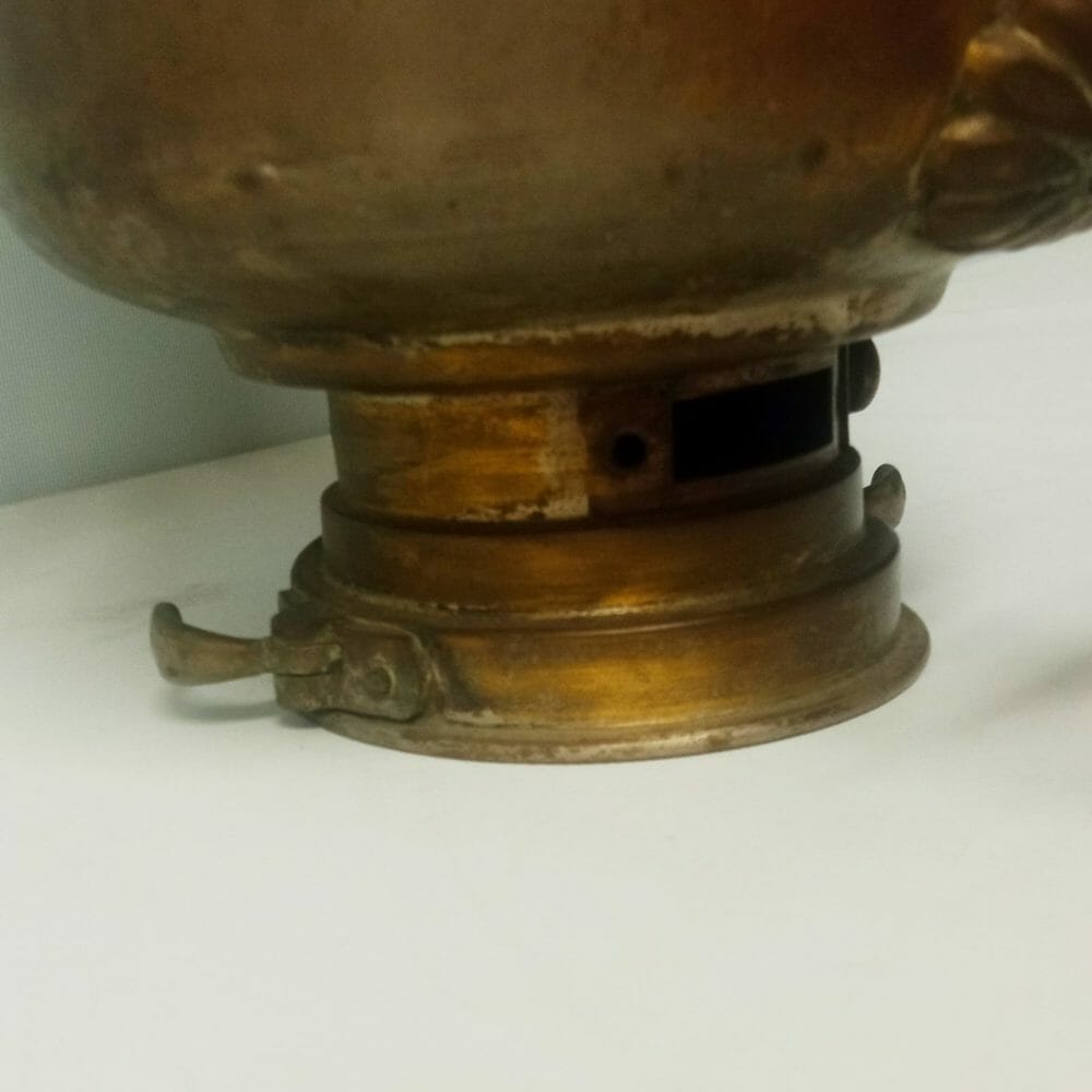 Antico Samovar Russo completamente realizzato in ottone risalente al 1906 .L’articolo è in buone condizioni ma manca il basamento, necessita di una lucidatura per valorizzare le iscrizioni frontali tra cui appare la datazione.