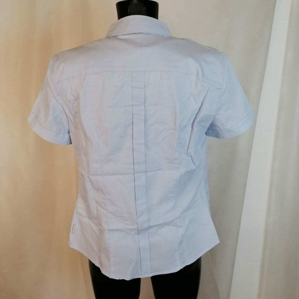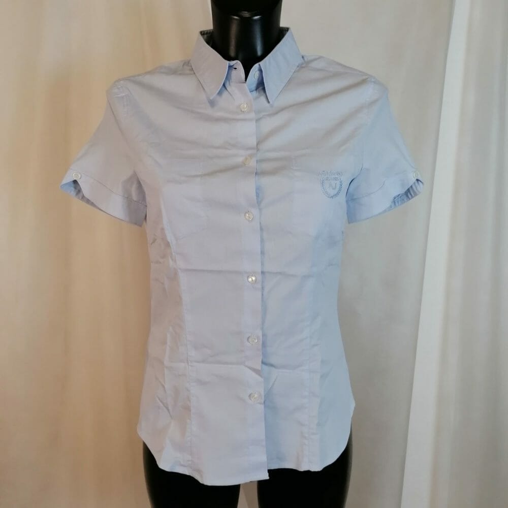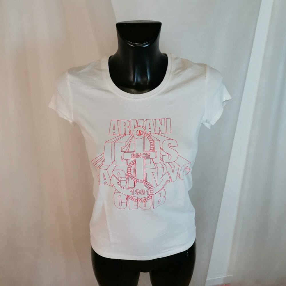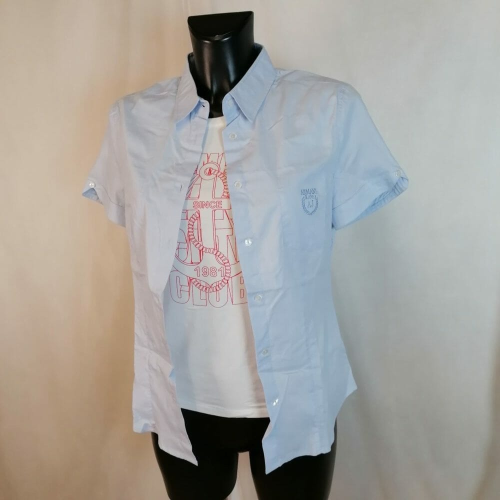 Armani Jeans, camicia e t-shirt. Camicia mezze maniche in cotone 70 % elastan 30%, due taschini interni, logo ricamato sul petto, taglio femminile, colore celeste. Maglietta mezze maniche bianca con stampa rossa, finitura rossa all’interno del colletto, etichetta con logo. Cotone elasticizzato.
