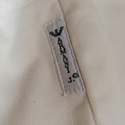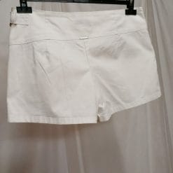 Armani Jeans gonna pantalone bianca. Modello molto originale, davanti è una minigonna e dietro un pantaloncino corto. Chiusura laterale con gancio dorato e zip. Bel motivo di pieghe frontale.