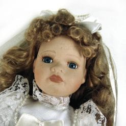 Bambola in porcellana agghindata da sposina, con abitino in raso bianco e tulle ricamato, a risaltare due sognanti occhi azzurri. Sull’occhio destro mancano le ciglia.