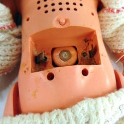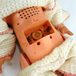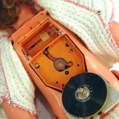 Bambola vintage Italcremona con disco per funzione sonora (non funzionante, da sistemare), occhi apribili e vestitino in lana. Il vano batterie presenta incrostazioni. Da collezionare, da amare.