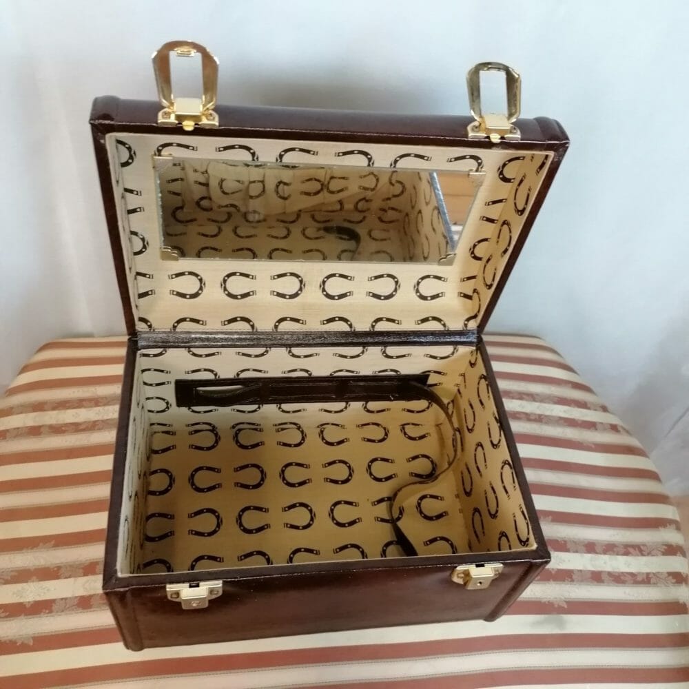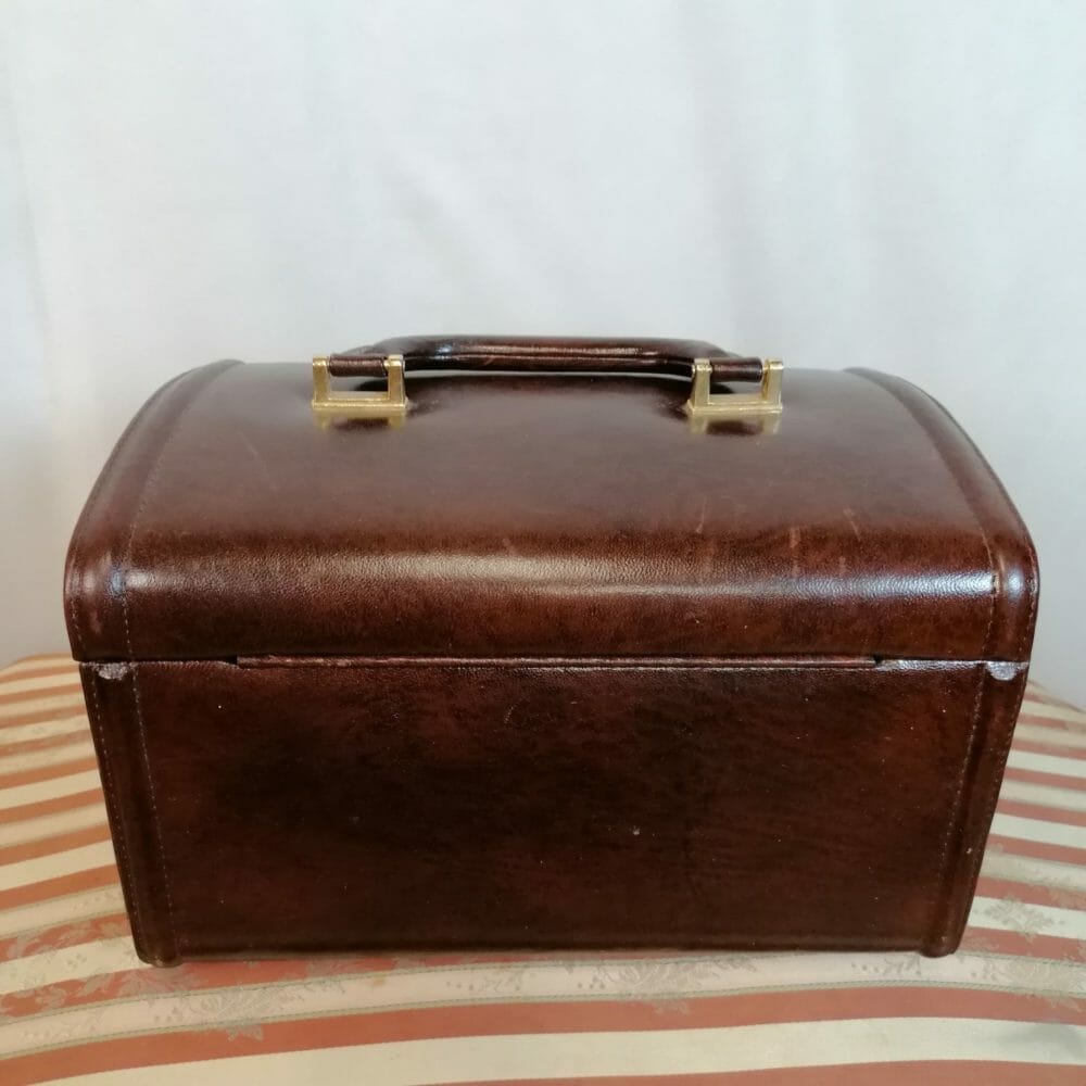 Favoloso beauty vintage in pelle foderato in tessuto, con specchio e vani per gli oggetti. Un accessorio veramente speciale per il prossimo viaggio.