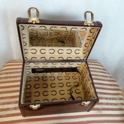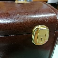 Bauletto beauty in pelle rigido vintage. Dettagli dorati, all’interno ci sono una tasca e una cinghia per fissare gli oggetti. Si può chiudere con la chiave in dotazione. Sul fondo quattro piedini metallici.