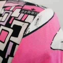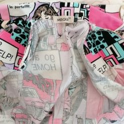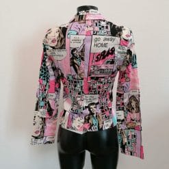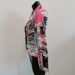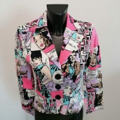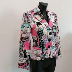 Blazer leggero sfoderato fantasia a fumetti sui toni rosa bianco e azzurro. Spalle imbottite e taglio sfiancato molto femminile.