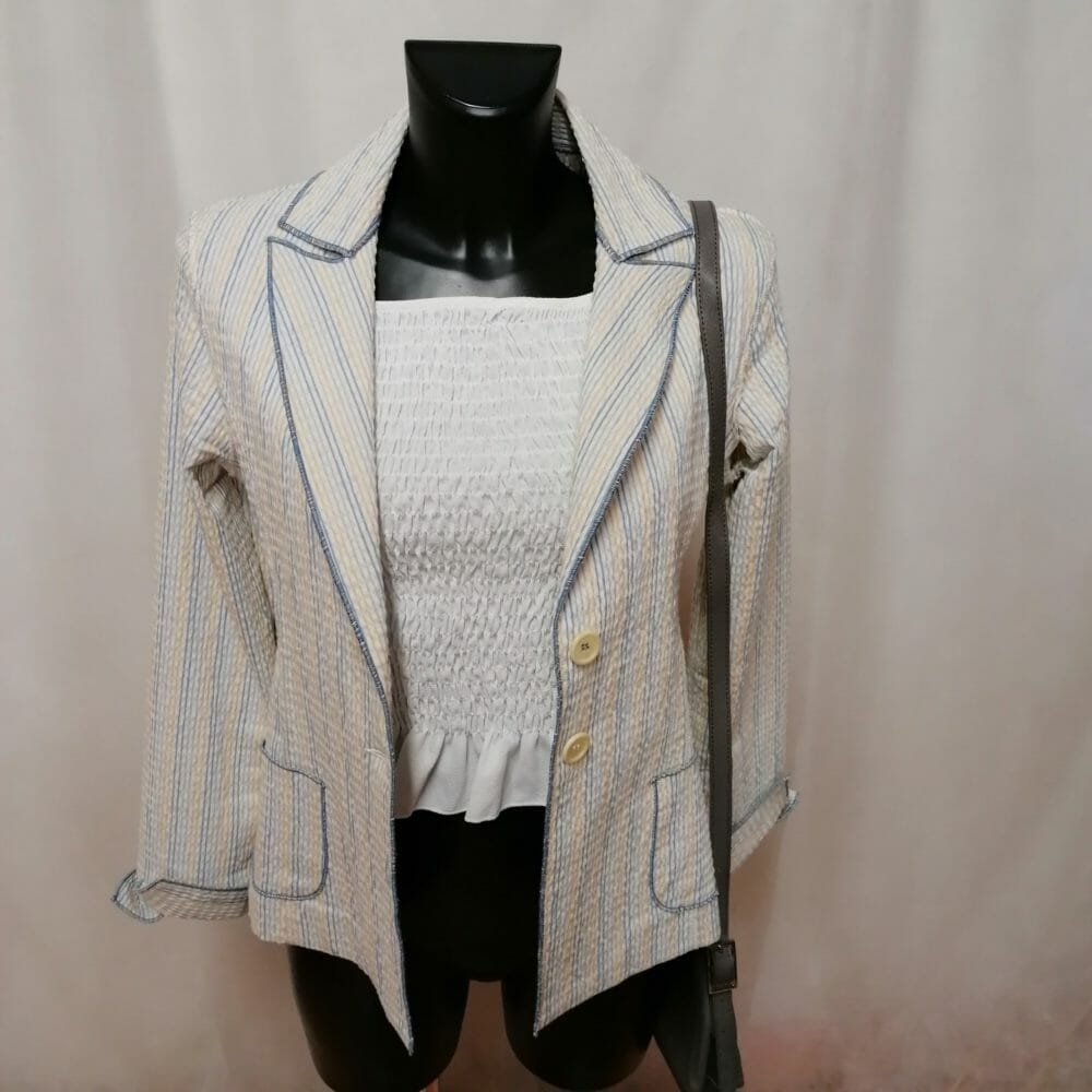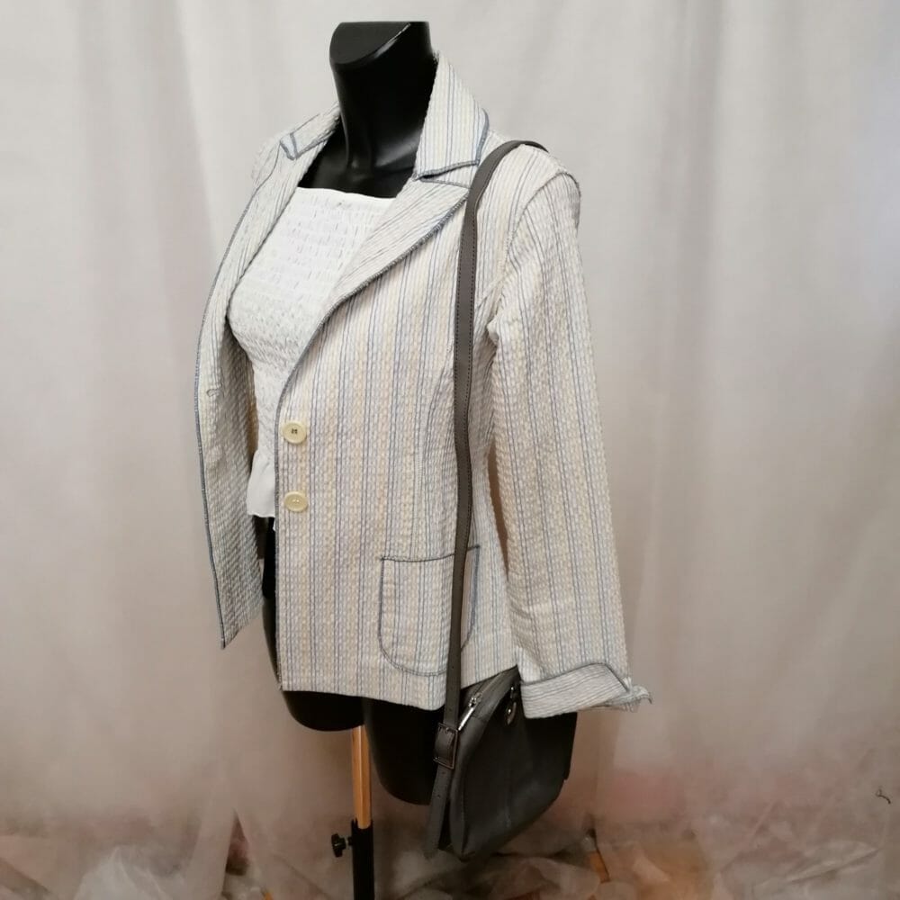 Blazer “lo sfizio” Milano, 95% cotone 5% elastan. Bella lavorazione con cuciture a vista e tessuto goffrato a righe. Leggero e perfetto per la primavera – estate.