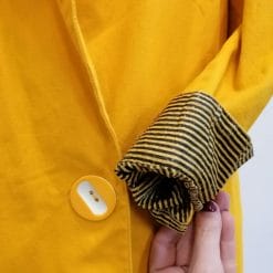 Blazer in cotone giallo anni 90, bottone singolo, sfoderato, maniche da risvoltare con interno a righe. Denim leggero, linea over, due grosse tasche frontali.
