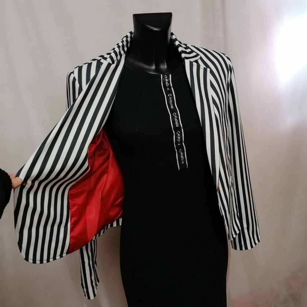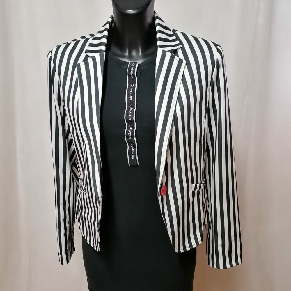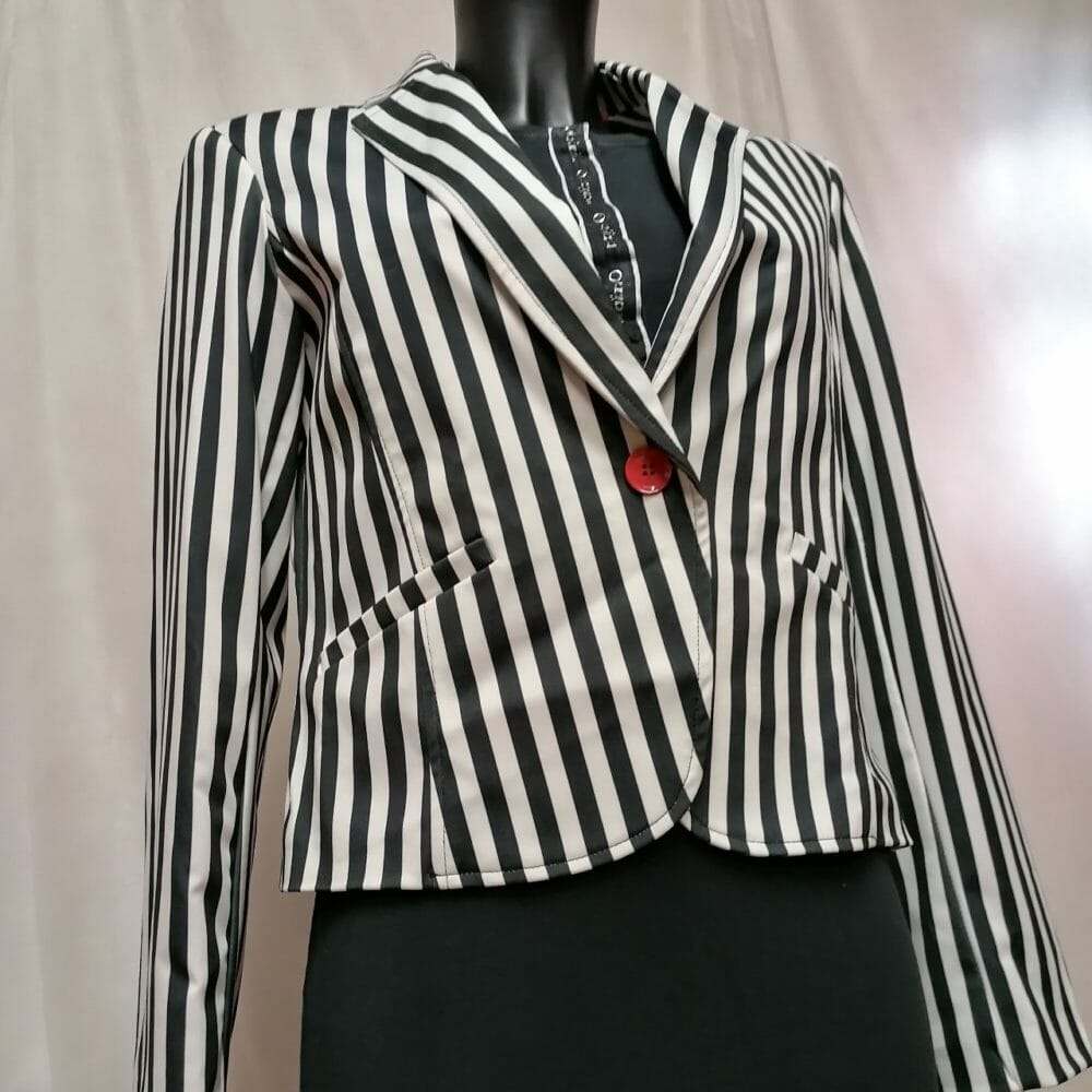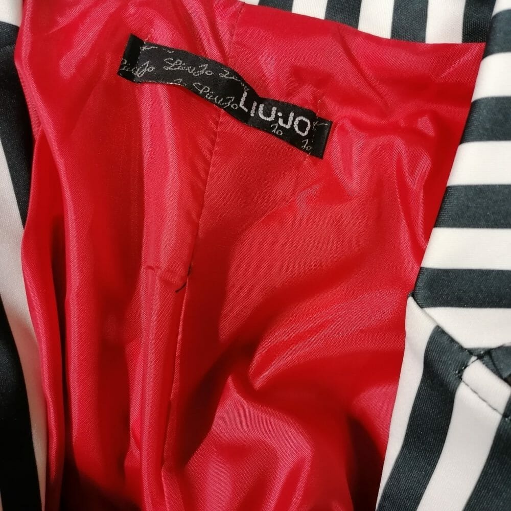 Blazer Liu-Jo particolarissimo a righe bianche e nere con fodera rossa, spalle imbottite. Materiale liscio e lucido, etichetta con taglia e composizione tagliata.