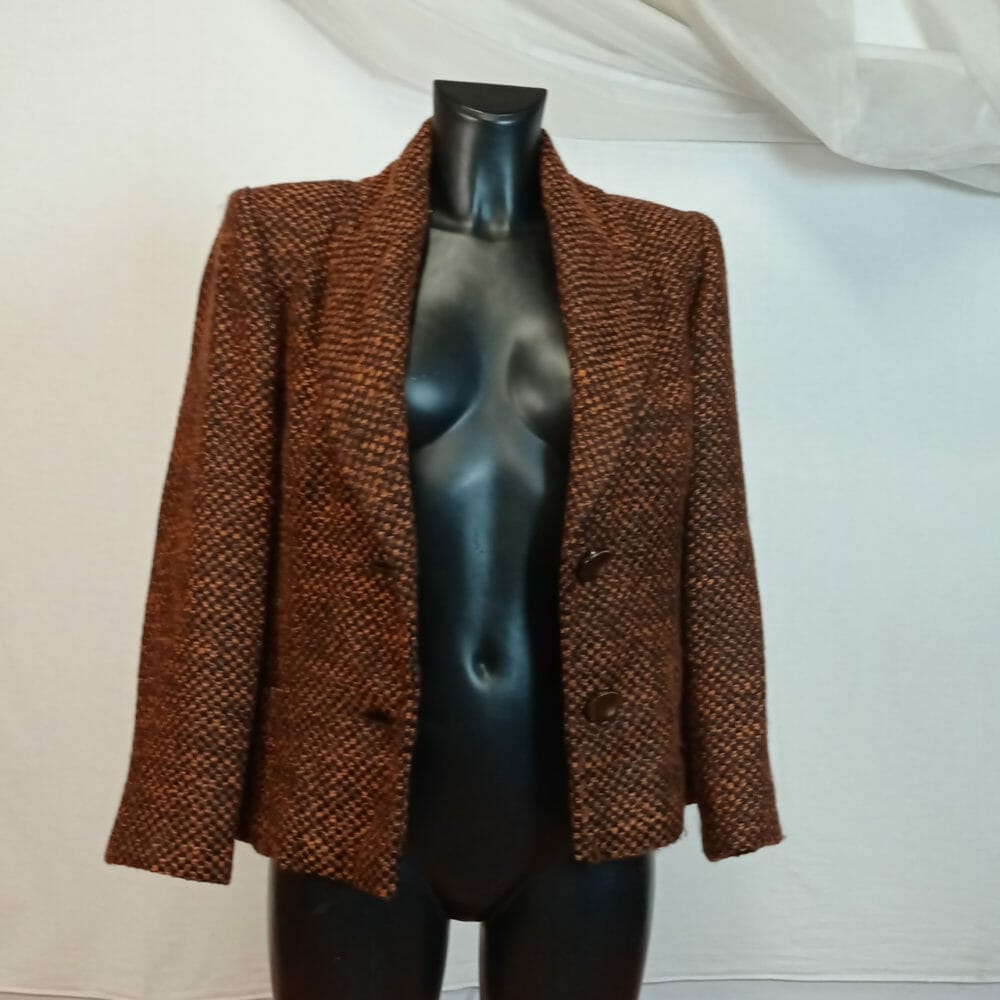 Blazer vintage spalline imbottite, probabilmente in lana. Composizione non riportata. Due tasche anteriori.