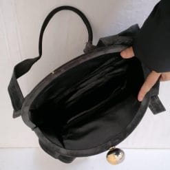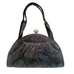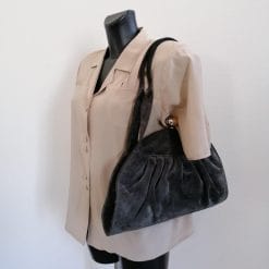 Molto capiente questa bella borsetta da spalla dei primi anni duemila, realizzata in un palle scamosciata color antracite. Particolare la forma a portamonete con grosso pomello centrale per metà color argento e per metà dorato.