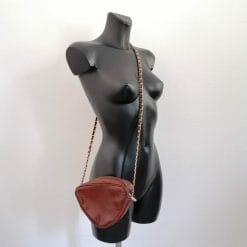 Borsina vintage in pelle di rettile con lunga tracolla, marrone. Forma triangolare, particolare tracolla intrecciata in pelle e catena dorata.
