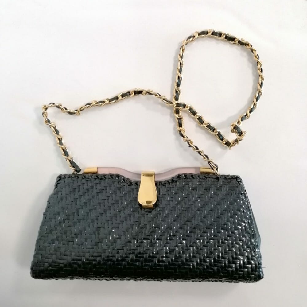 Borsetta vintage in rattan intrecciato con dettagli in metallo dorato e plastica. Tracollina a catenella che si può riporre all’interno trasformando la borsa in clutch.