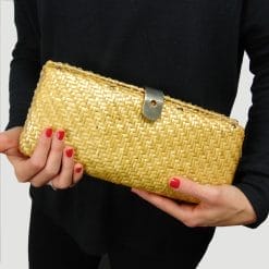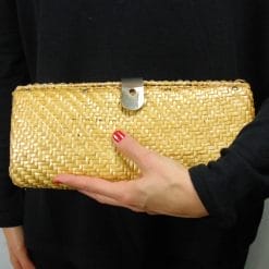 Pochette in vimini degli anni ’60 in ottime condizioni. Foderata in pelle, ha la catena di tracolla e la chiusura in metallo. Tutte le parti sono funzionanti e in buono stato. All’interno presenta una piccola taschina per gli oggetti più piccoli.