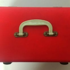 Valigetta rossa con rifiniture in metallo, buone condizioni solo uno strappo lieve sull’etichetta frontale. Raro pezzo da collezione!